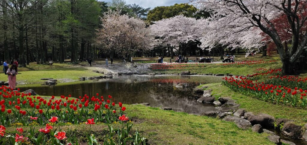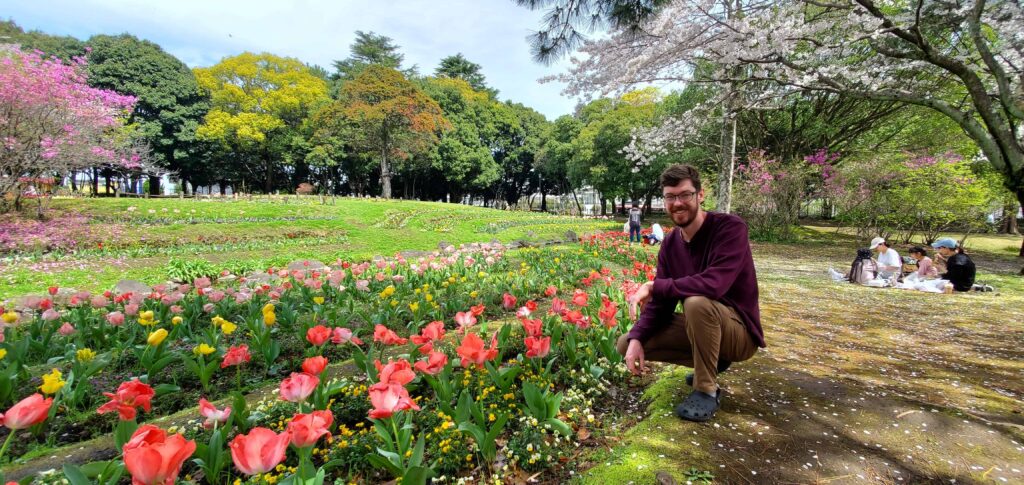 Our last stop on our way back to our last night’s stay in Fukuoka before we returned home was Beppu Park. We originally were not planning on stopping there and I am SO glad that we did! It was, without a doubt, the prettiest place I’ve ever seen. All the sakura trees were in full bloom and some of the petals were falling in the wind, making it look like it was snowing! On top of that, the tulips were blooming and the sun was shining – it really felt like something out of a fairy tale! We explored the park, took another hundred pictures of the cherry trees, and walked through the coolest bamboo forest.