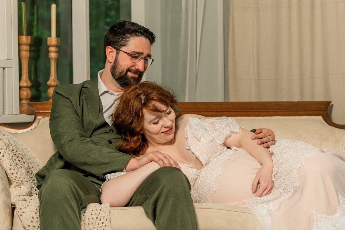 The plan was to catch that dreamy golden hour glow during the evening, but Mother Nature had other ideas. As soon as we arrived, the skies opened up and we were met with a steady downpour! You know what they say about the weather in North Carolina: if you don’t like it, just wait 10 minutes! Thankfully, The Marigold Greenhouse provided the perfect cozy shelter. Nestled among greenhouse fabrics, vintage Victorian couches, and blooming flower beds, we embraced the moody light and made some magic happen! The rain created a soft soundtrack in the background while the chandeliers inside added a romantic glow that elevated the entire shoot.