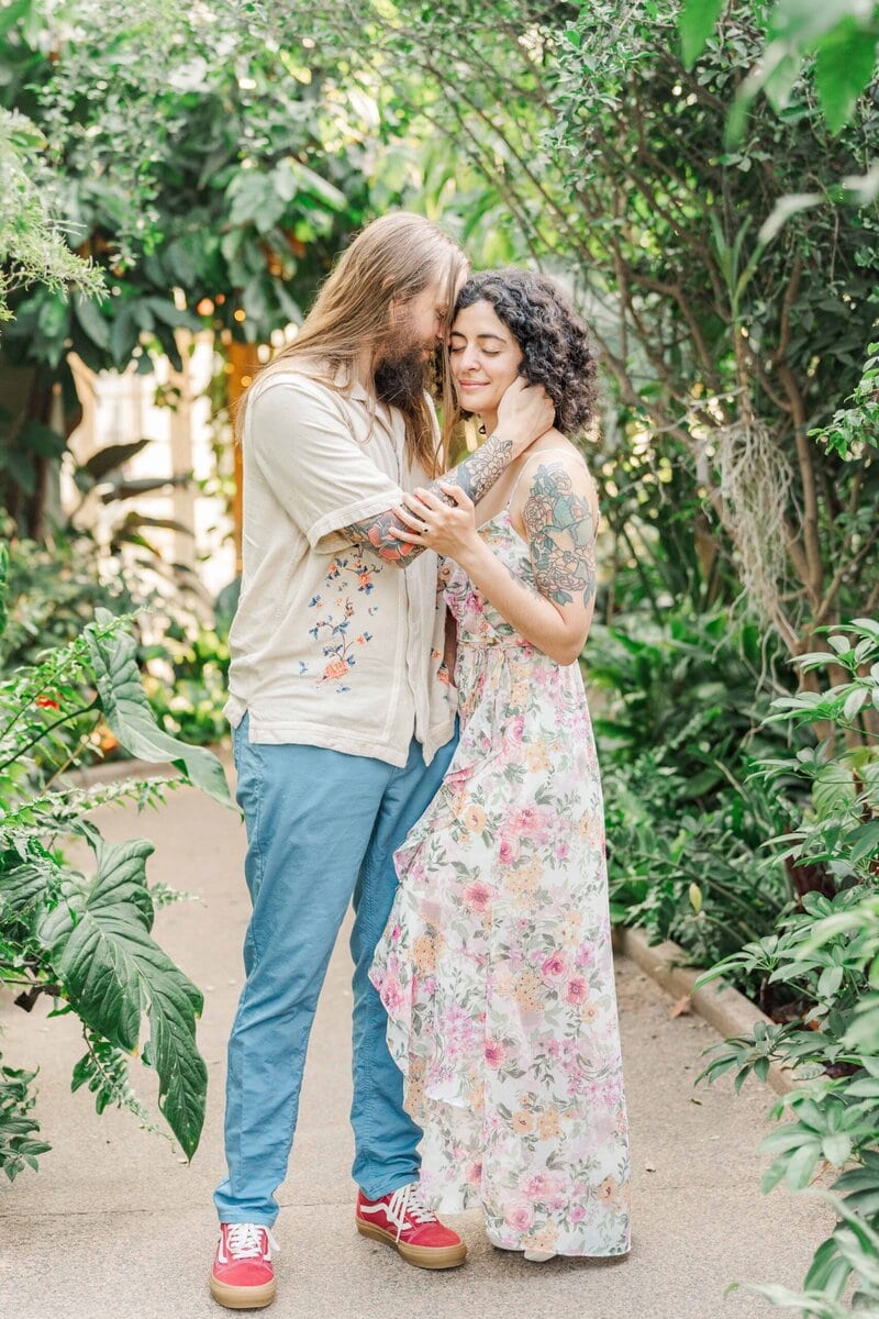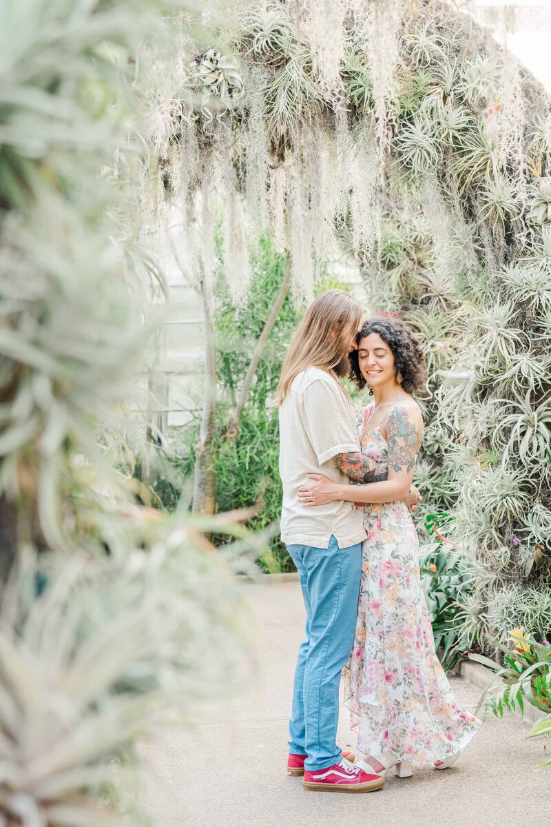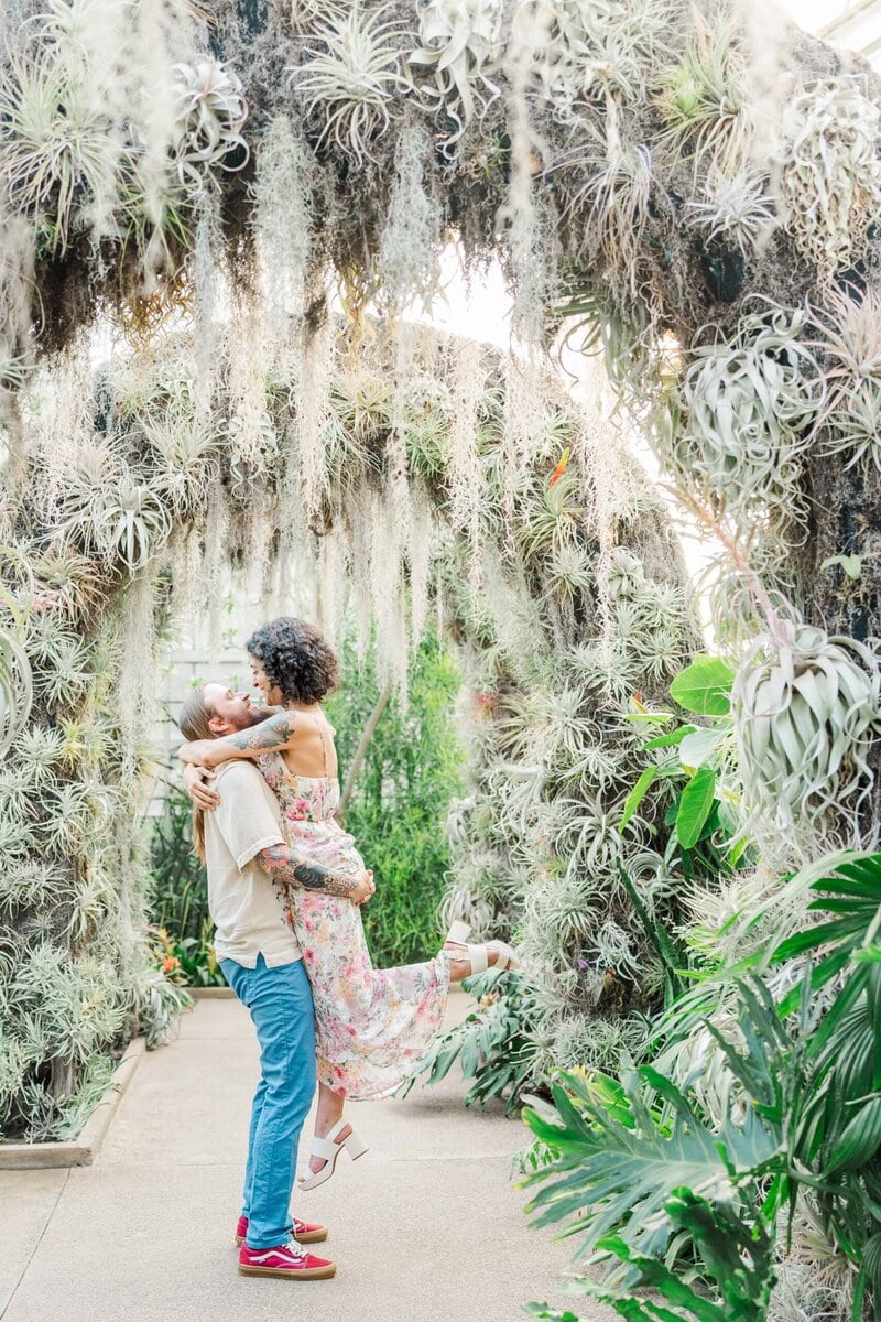 From there, we stepped into the William H. Williamson, III Conservatory, often lovingly called the Orchid Conservatory. Inside, the display of tropical plants—including the most incredible succulent and air plant arches—made us feel like we were in a rainforest. The light coming through the glass ceiling created this natural spotlight effect that was honestly a photographer’s dream! My personal favorite was when Eric picked Maria up and twirled her around under the Spanish moss covered arches.