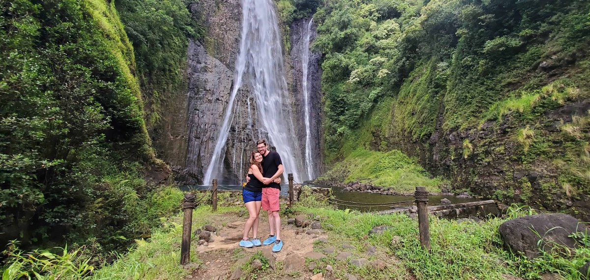 One of the coolest things we did during our honeymoon was exploring Manawaiopuna Falls (AKA Jurassic Falls!!). This was the waterfall that was used in the movie Jurassic Park during their helicopter landing on Isla Nublar. I absolutely LOVE Jurassic Park. It’s one of my favorite movies. I even walked down the aisle to a slowed down piano version of the main theme song! The actual falls are on private property, but the owners allow a helicopter company to briefly land near the falls, so we were able to nerd out and take some pictures with this famous waterfall!