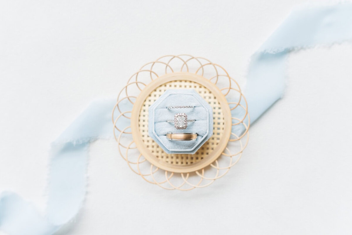 4. Ring Boxes: Chic ring boxes not only protect your rings but also add a touch of elegance to your photos. Neutral ring boxes go with everything, while colorful ring boxes can add some pop to your flat lay, especially when your ring box matches your wedding day florals!