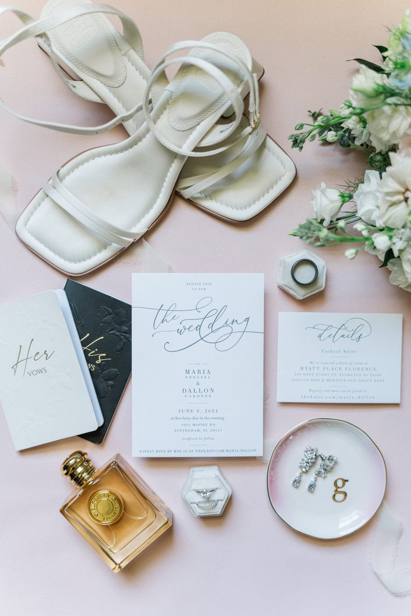 Flat lay photos give me a chance to arrange and photograph your wedding essentials from a top-down view. It’s not just about capturing each item; it’s about telling the story of your day. From your stunning invitations to your shiny jewelry, every piece adds to the narrative of your wedding.