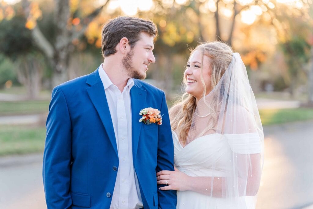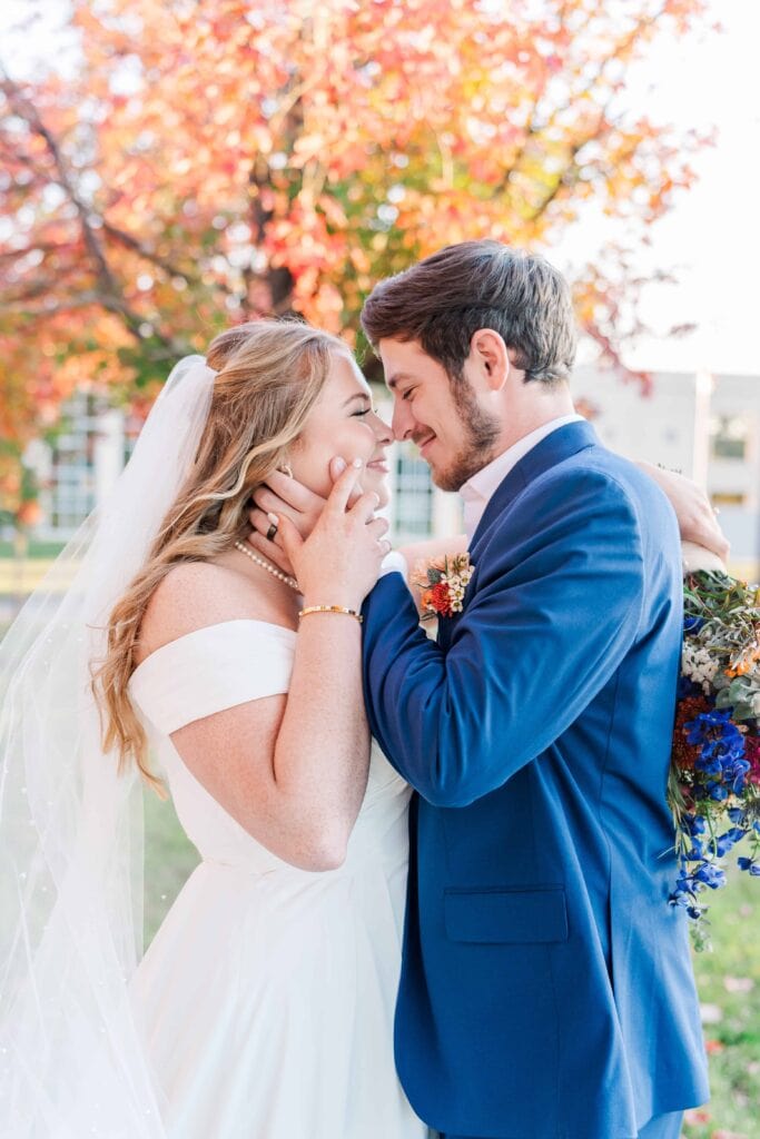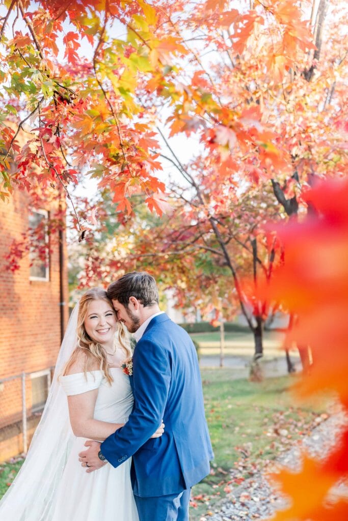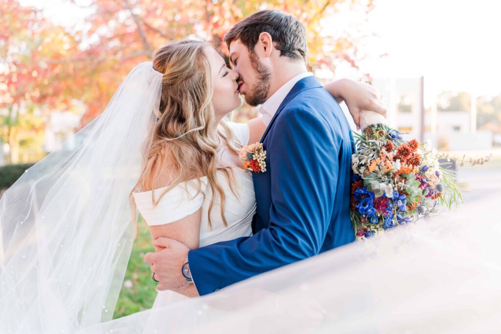 After the ceremony, we snuck across the street for some couples photos. Nathan and Elaina wanted a little nature in their shots (it was fall after all, we gotta try and get some of those gorgeous fall colors!), and we lucked out big time. The trees were showing off with these gorgeous red fall leaves, and it was the perfect contrast to the industrial backdrop of the venue. Their flowing veil photos right in front of that gorgeous red tree were my absolute favorites!