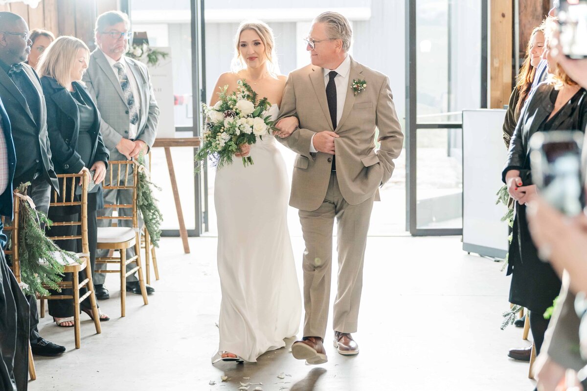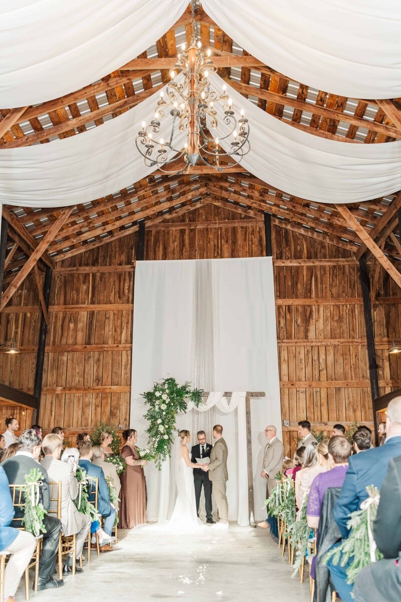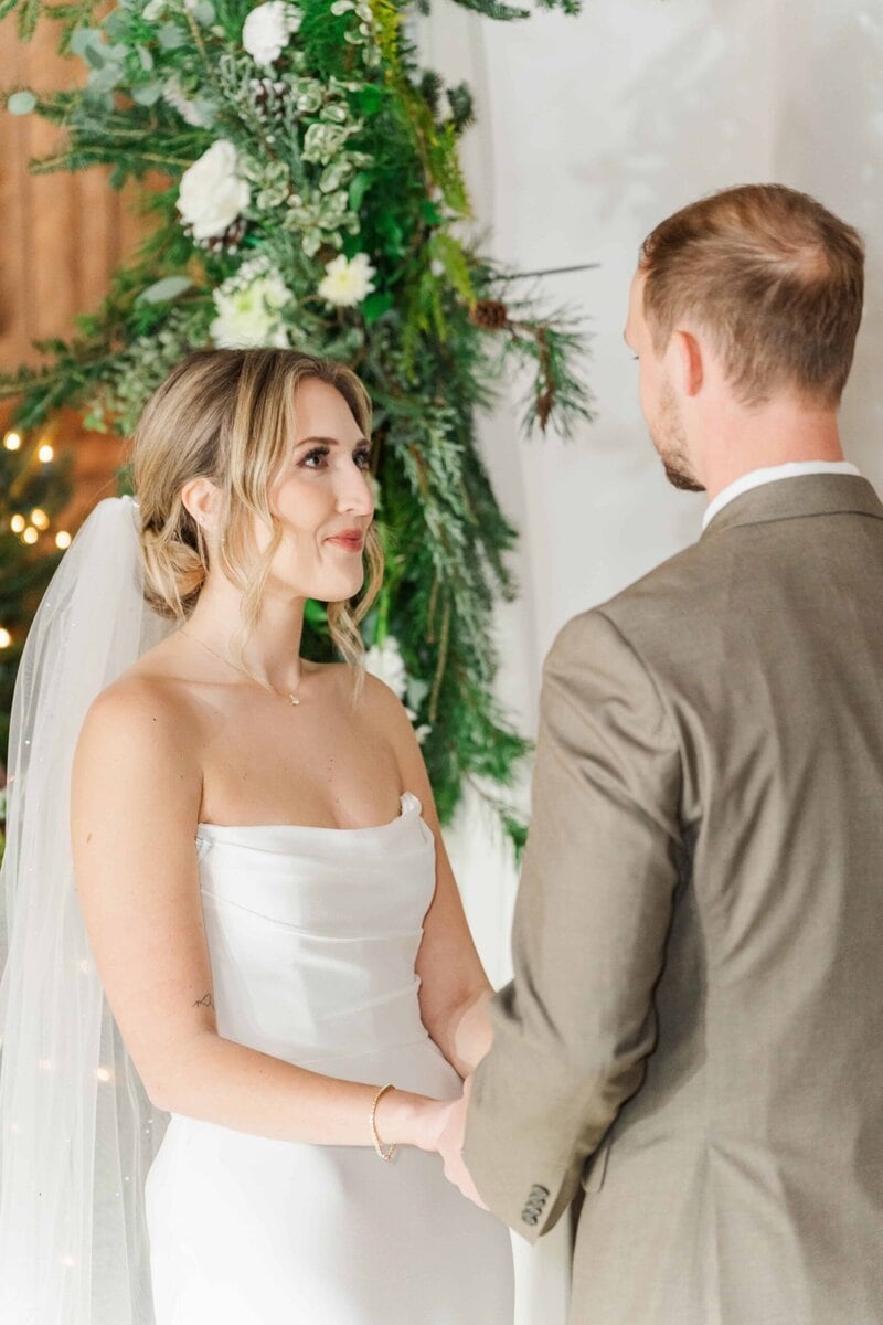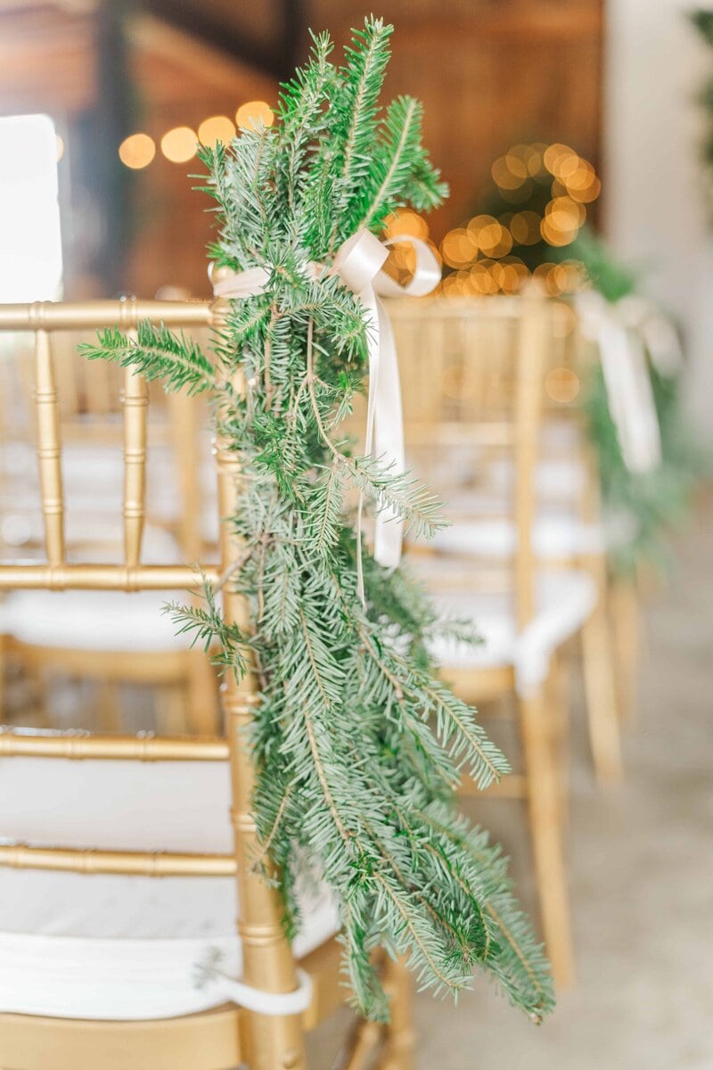 One of the standout features of The Emerald Hill Wedding Venue is its breathtaking outdoor setting. As an ideal NC destination wedding venue, the property offers couples the option to host their ceremony in a variety of stunning locations. In addition to the breathtaking views for its outdoor spots, the venue is known for its versatile indoor spaces. Because of the chilly, December weather, Savannah and Hunter decided to move the ceremony indoors. At first, I was a little bummed that we didn’t have a pond view for the ceremony, but I was so excited when I saw the beautiful setting of the indoor barn space! Gorgeous chandeliers, classic white drapery, lighted trees, and golden chairs accented with greenery that perfectly fit with Savannah and Hunter’s classy holiday theme. The warm tones of the evergreens paired with crisp white florals that made the space festive with a touch of elegance. Many venues don’t have a space available that’s big enough for the ceremony in the event of rain or chilly weather, but The Emerald Hill is an incredible venue in the fact that they other both indoor and outdoor spaces that are both stunningly beautiful.