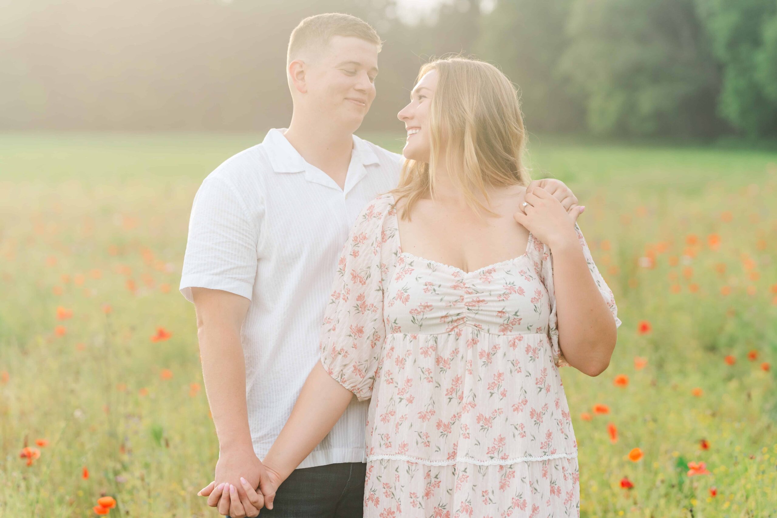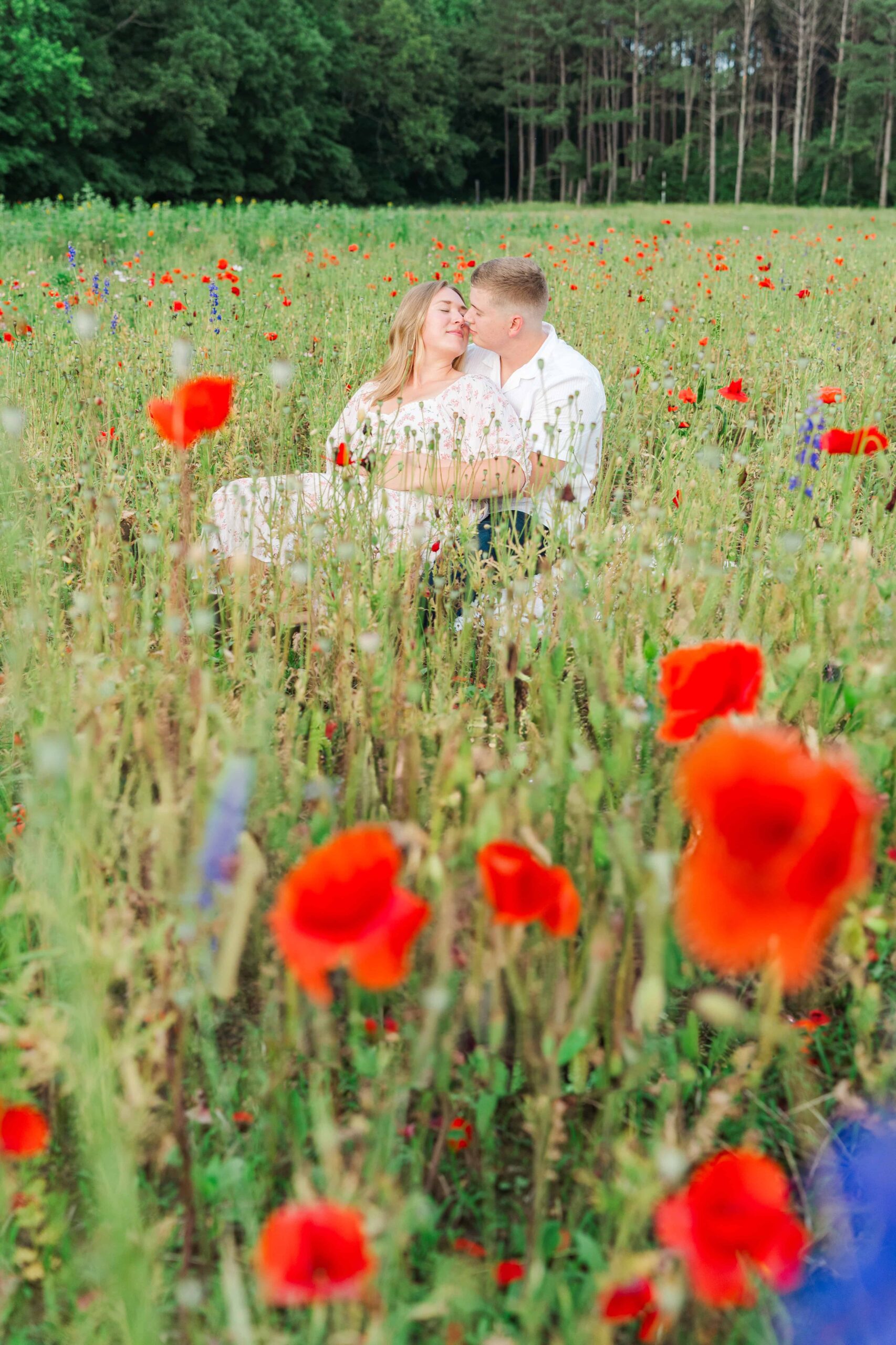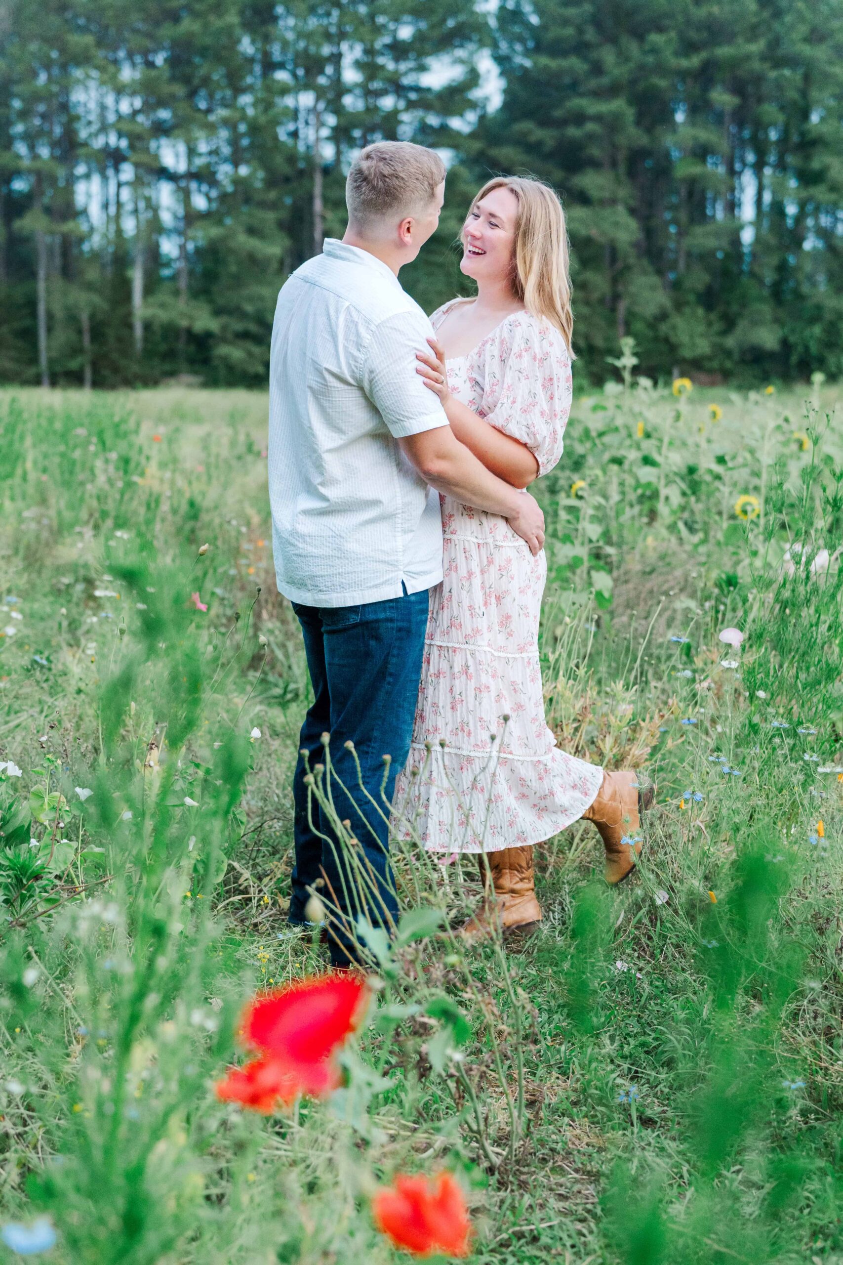 Due to being on maternity leave during much of the spring season, I wasn’t able to photograph at Blue Hill Garden Monroe NC until later in the season. Thankfully, Grace and Jacob were flexible—and it worked out perfectly. We visited on a warm Friday evening after a week of rain, and the garden was still bursting with color. We were greeted with bright red poppies, romantic pink flowers, soft purple larkspur, cheery sunflowers, and a variety of wildflowers in bloom.