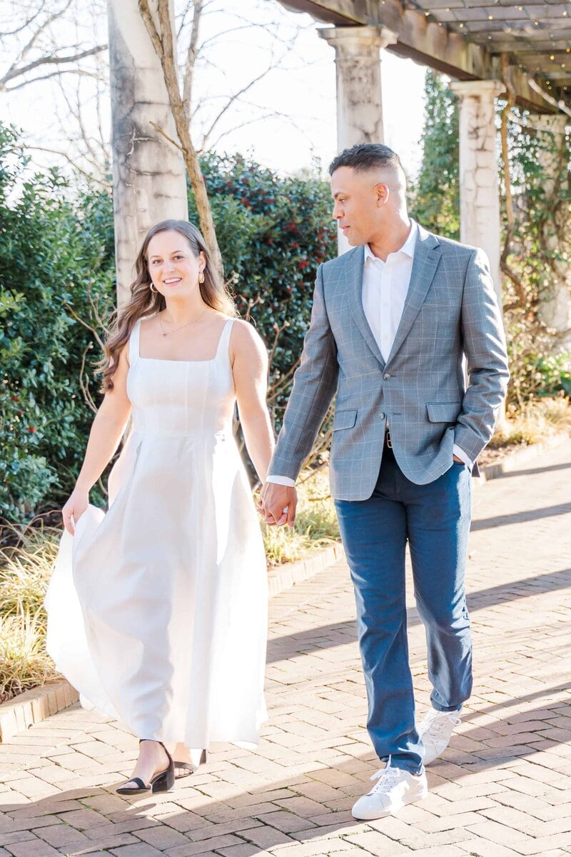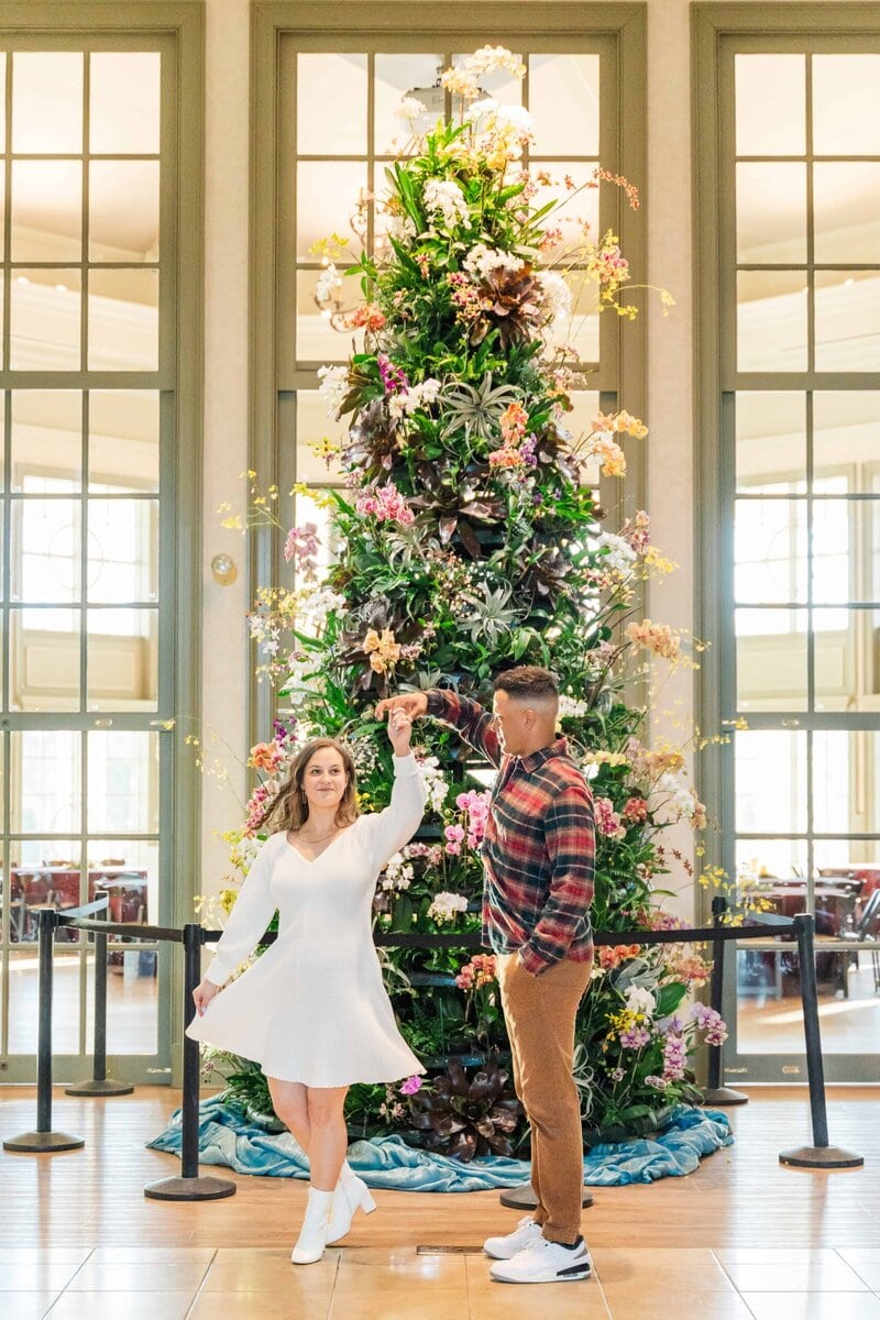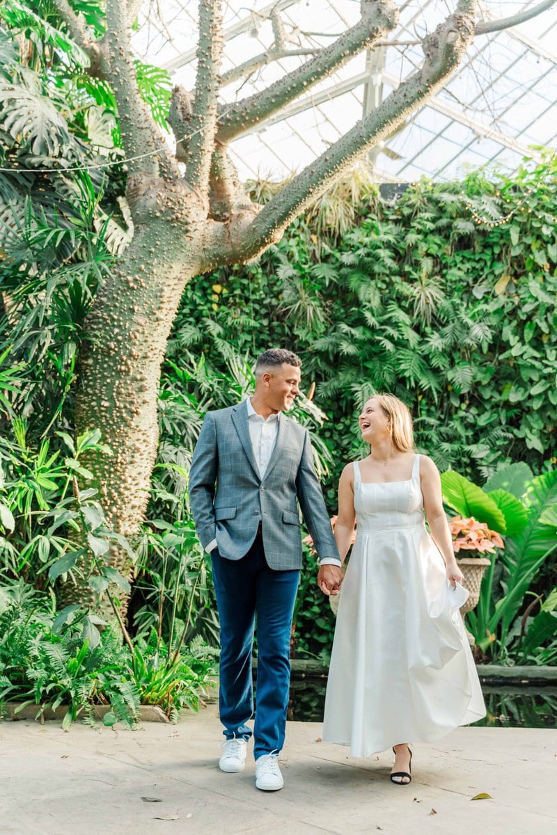 When Merritt and Trip reached out, they knew they wanted winter engagement photos that felt timeless and romantic without heavy coats or chilly vibes. They also wanted greenery, movement, and a location that felt a little magical. Daniel Stowe Conservancy checked every box (It’s one of my favorite spots in Charlotte for this very reason!). Between the Orchid Conservatory and the palm trees outside, it honestly felt like a summer escape even though this session took place in December!