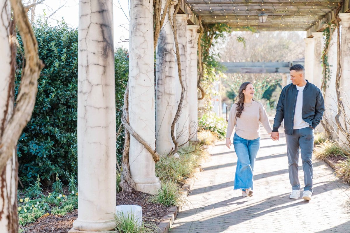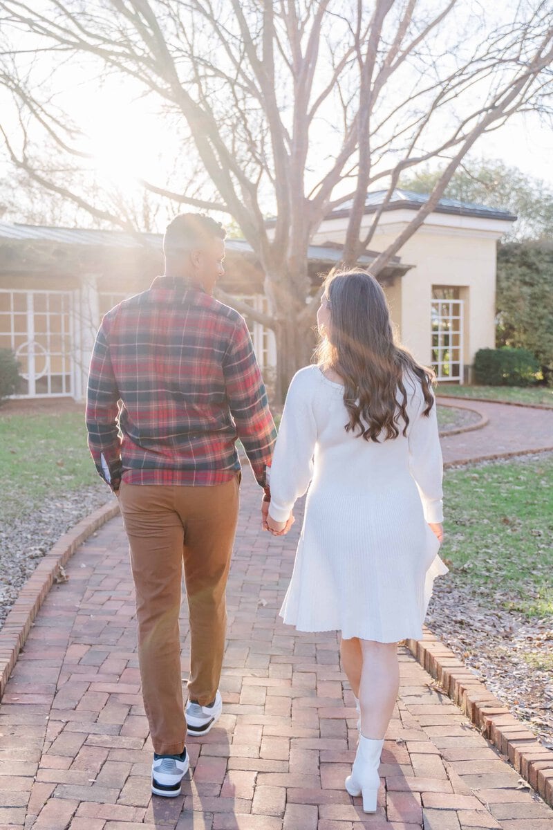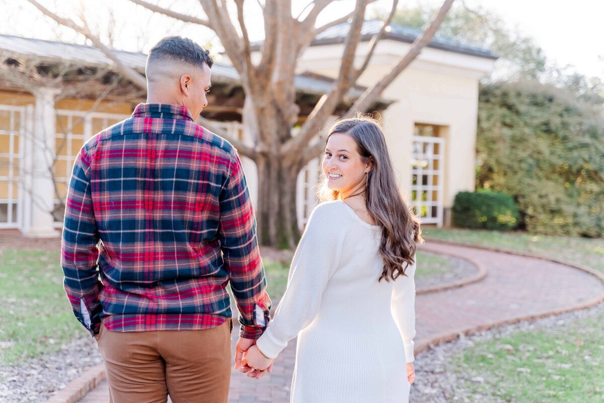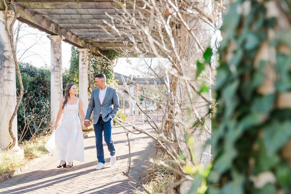 When Merritt and Trip reached out, they knew they wanted winter engagement photos that felt timeless and romantic without heavy coats or chilly vibes. They also wanted greenery, movement, and a location that felt a little magical. Daniel Stowe Conservancy checked every box (It’s one of my favorite spots in Charlotte for this very reason!). Between the Orchid Conservatory and the palm trees outside, it honestly felt like a summer escape even though this session took place in December!