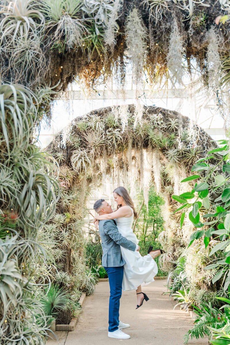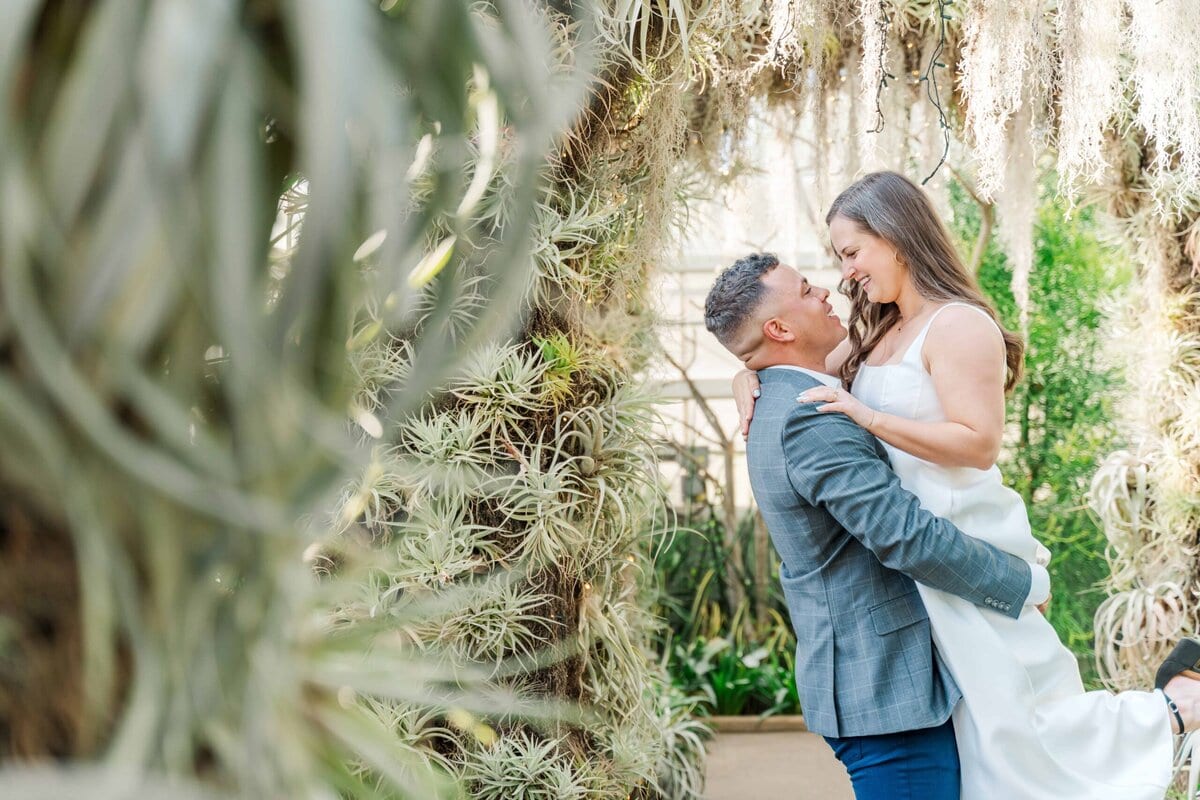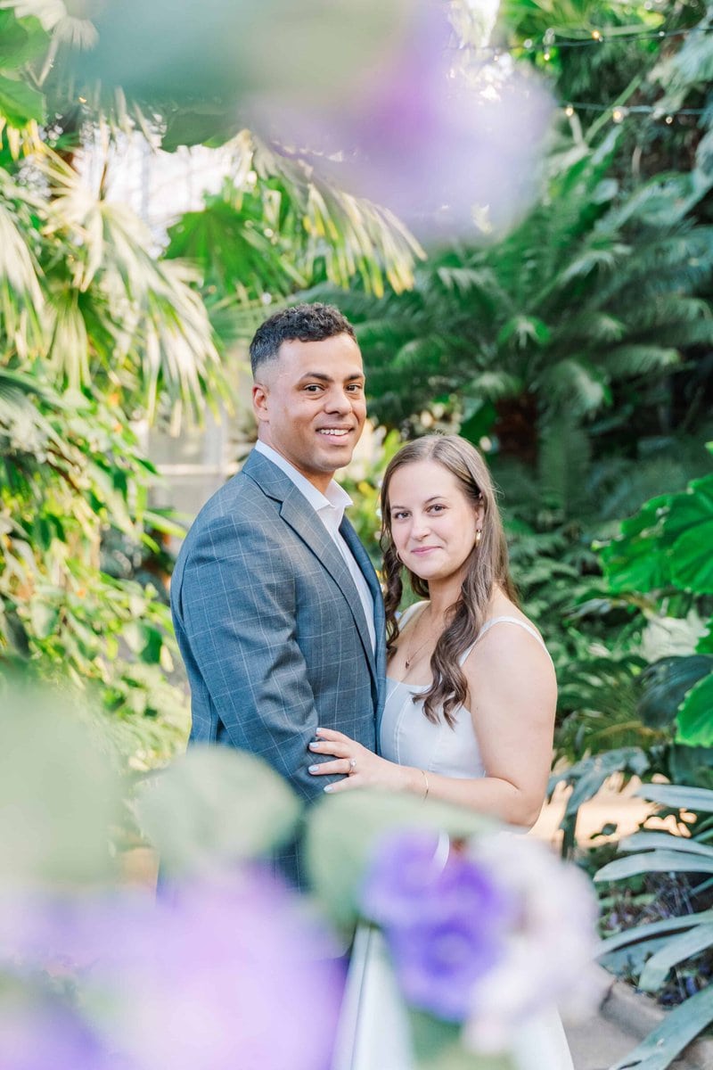 We lucked out with one of those rare, sunny winter days in Charlotte NC. The light was soft, the air was warm, and the conservatory was glowing. The Orchid Conservatory is hands-down a favorite place for engagement sessions because it offers lush greenery year-round. It’s especially perfect for couples who want that fresh, garden feel without worrying about the season. The light is always so glowy in there too!