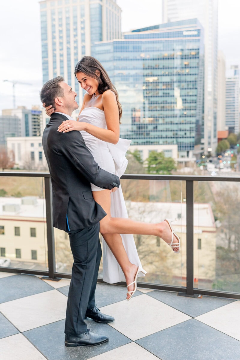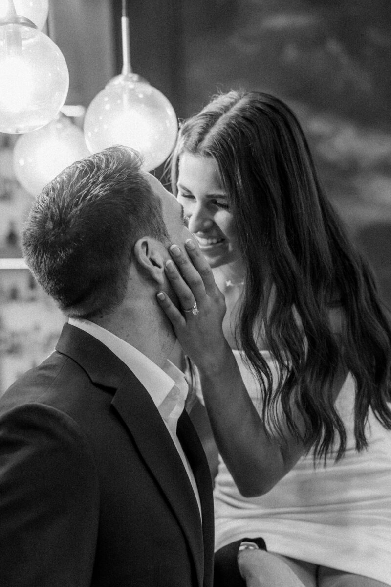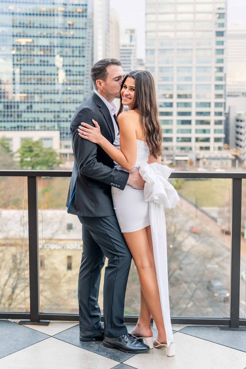 From there, it’s a short walking distance to The Crown of Queen City apartments, but since it started to rain, we opted to drive instead. One of Alyssa’s friends lives there and told her that the resident lounge would be a perfect spot for modern, sophisticated photos. She could not have been more right. The lounge offered a faux bar that looked incredibly realistic which made it feel like we stepped into a chic scene in a new city. There was also a velvet green couch that photographed like a dream and gave us a warm, intimate look for some of their portraits. And of course we had to take advantage of the rooftop view which gave us a breathtaking look at the Charlotte skyline! The skyline is one of the beautiful backdrops that makes promising Uptown Charlotte engagement photos so exciting.