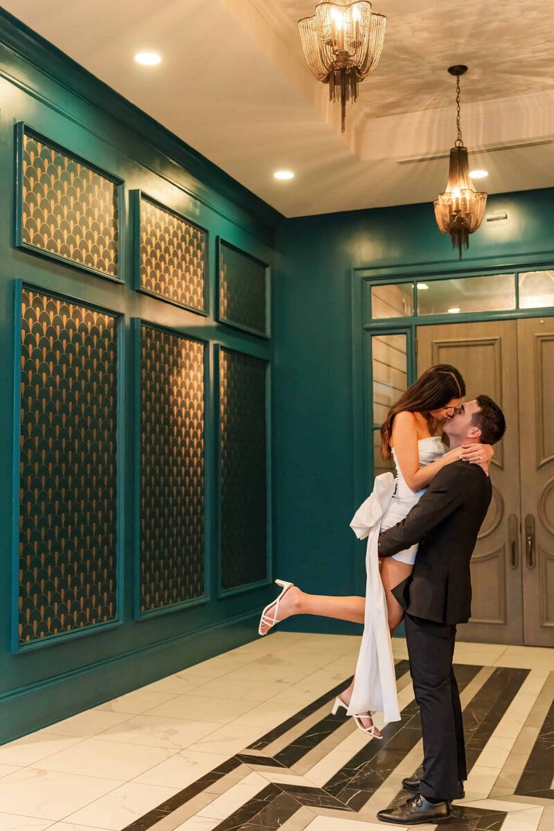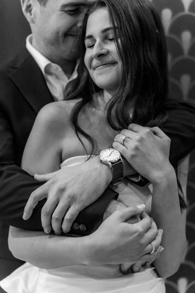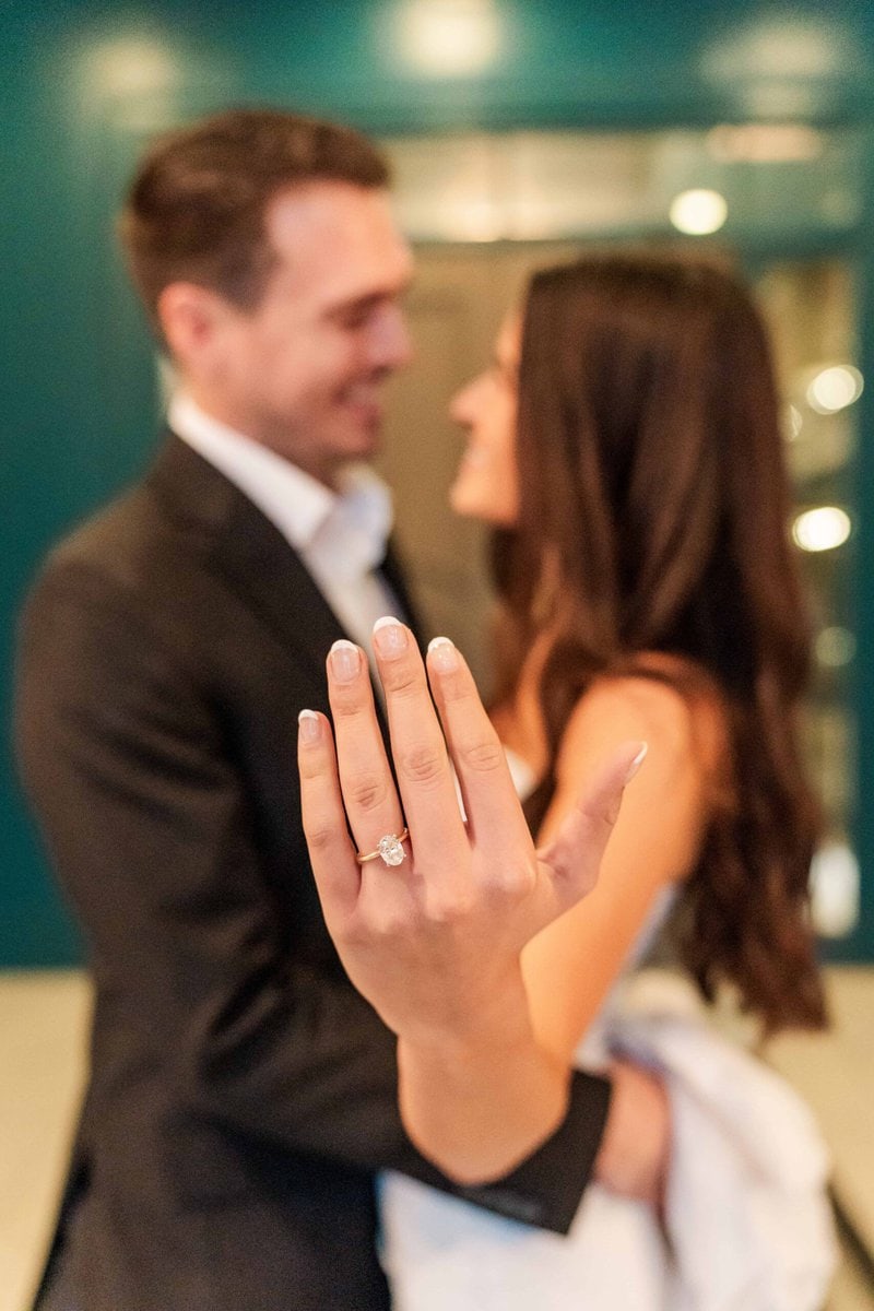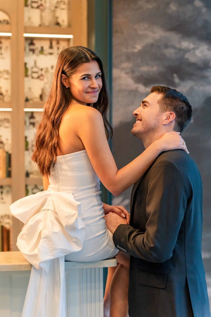 From there, it’s a short walking distance to The Crown of Queen City apartments, but since it started to rain, we opted to drive instead. One of Alyssa’s friends lives there and told her that the resident lounge would be a perfect spot for modern, sophisticated photos. She could not have been more right. The lounge offered a faux bar that looked incredibly realistic which made it feel like we stepped into a chic scene in a new city. There was also a velvet green couch that photographed like a dream and gave us a warm, intimate look for some of their portraits. And of course we had to take advantage of the rooftop view which gave us a breathtaking look at the Charlotte skyline! The skyline is one of the beautiful backdrops that makes promising Uptown Charlotte engagement photos so exciting.