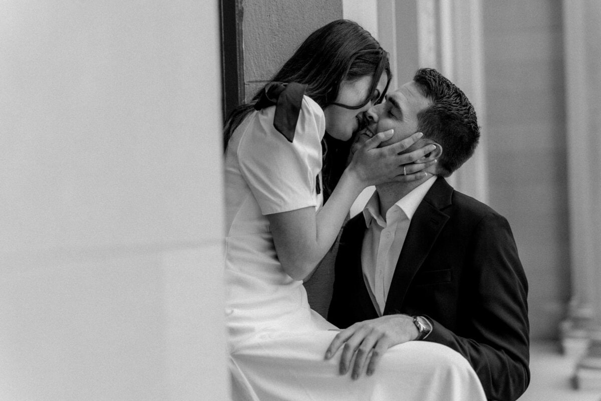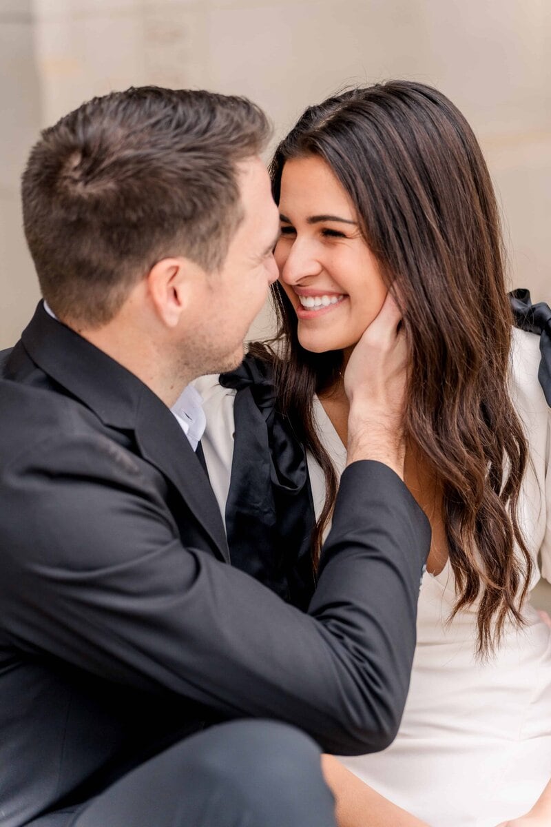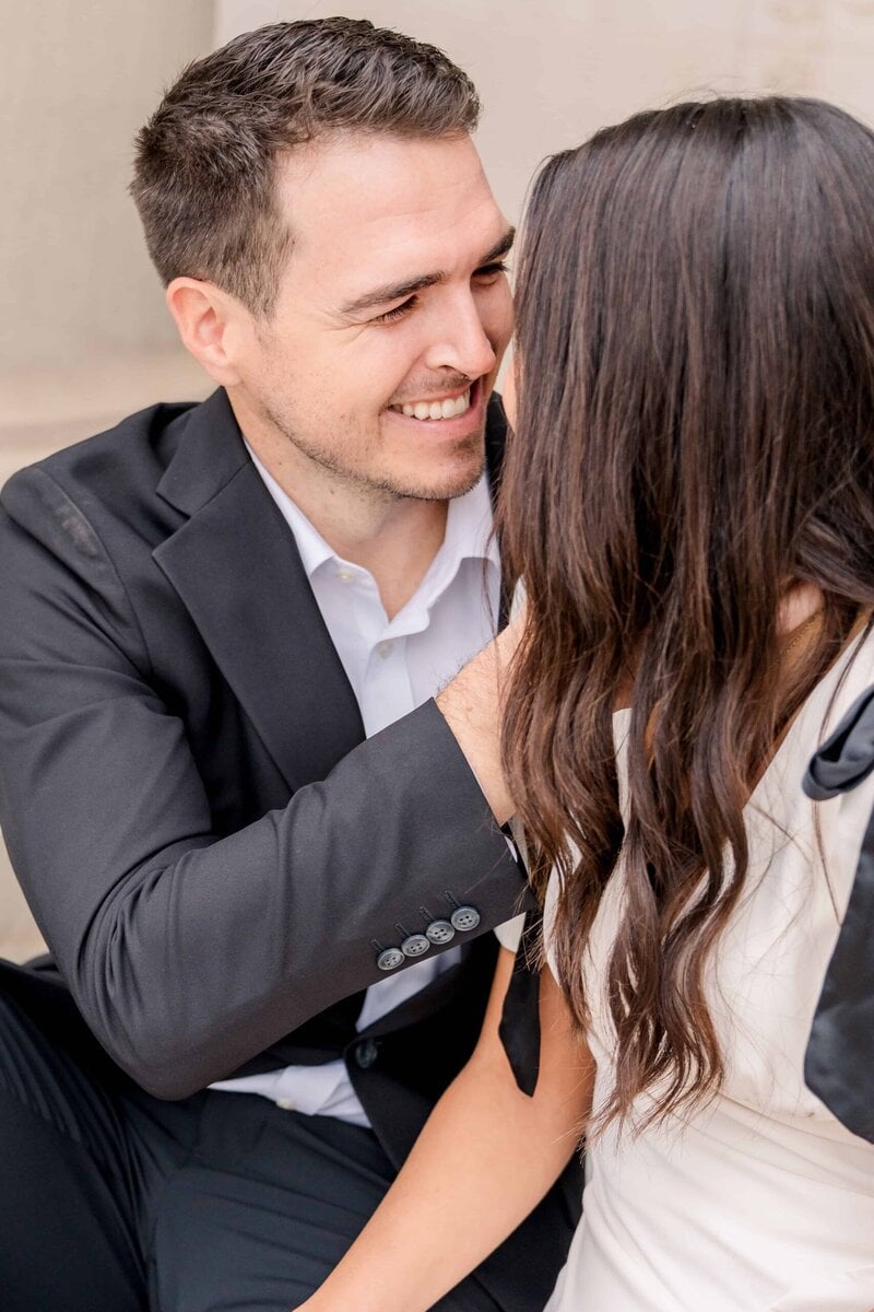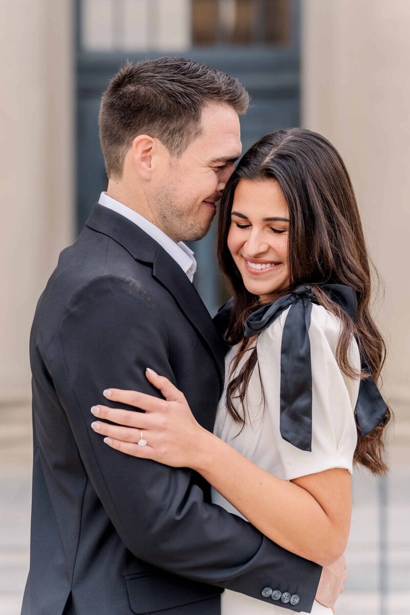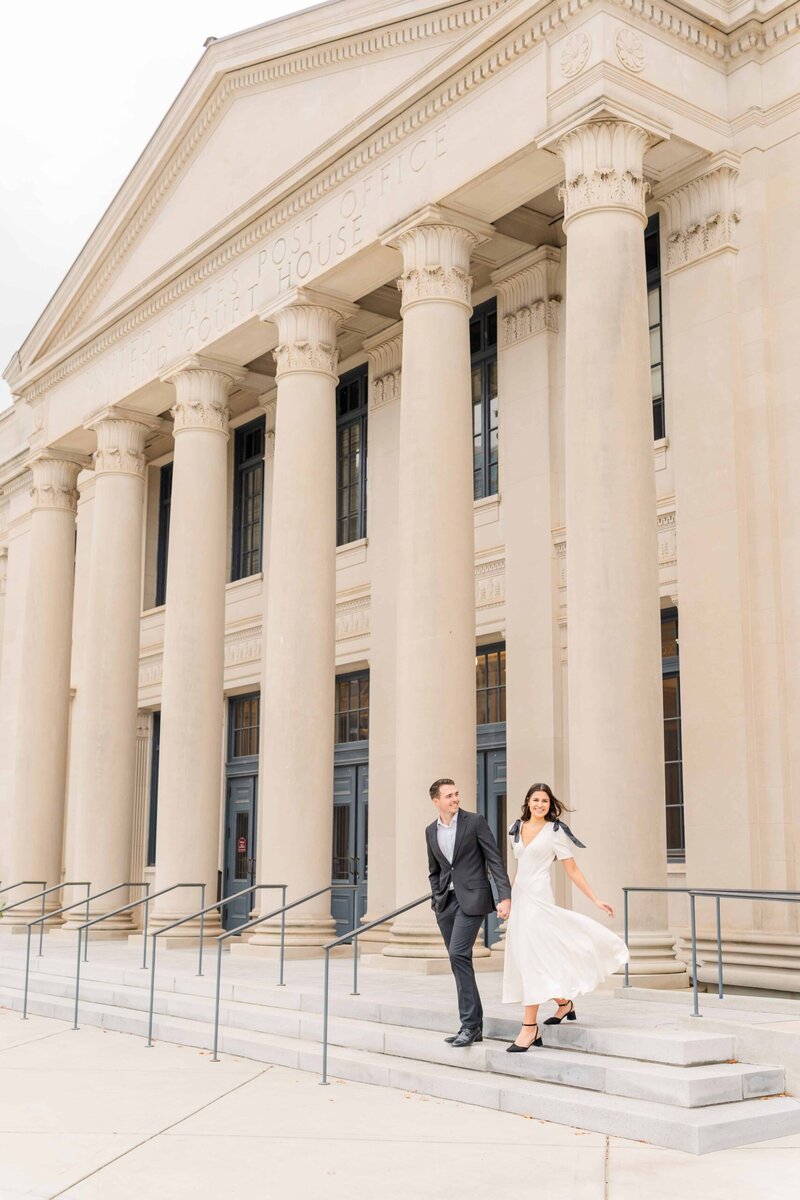 We started the session at the federal courthouse which is one of my favorite places for Charlotte engagement session photos. The white columns create such elegant lines and the architecture adds depth and drama to every angle. It is a picturesque spot that works beautifully for couples who love a refined and classy aesthetic. Even on a cloudy afternoon, the building lit up their images with clean tones and timeless style.